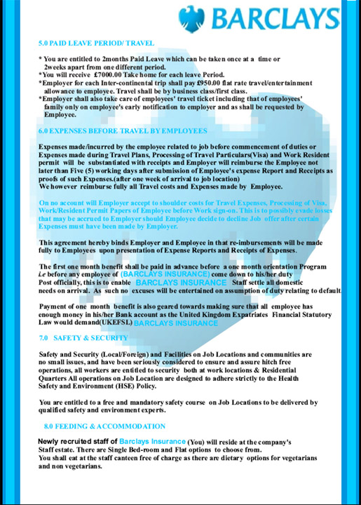 But perhaps, the biggest loose end is the exorbitant salary being offered. It is simply too good to be true and a real job offer would only have matched prevailing wages in the City of London. A five year contract for a job paying 9,500 pounds per month, various allowances, free travel and amenities in the midst of global financial turmoil is ridiculous for an entry to mid-level position even if the person had been grilled in multiple interviews!