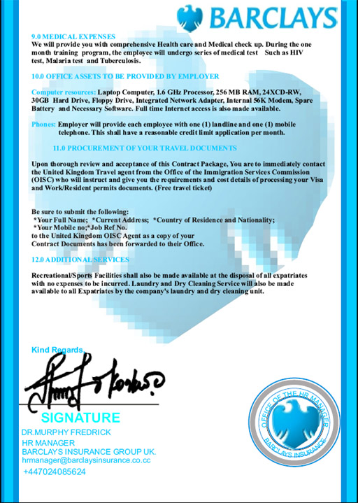 He thought it was odd that he had been given an offer letter without even having to interview, but he was soon elated with the salary mentioned in the offer letter. After he sat down and looked at the letter carefully, he felt the offer was too good to be true, so he shared with a couple of his friends, including me. I’m reproducing the offer letter along with some of the obvious warning signs with his permission and as a benefit to other potential job-seekers. I have no doubt that Barclays is unaware of the fraud committed in their good name, and I’m also refraining from mentioning where the job ad was posted, because it has subsequently been taken down at the request of concerned individuals.