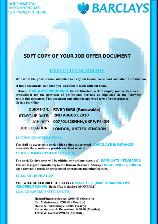 Recently, an acquaintance in India who has over five years experience in the financial sector, applied for a job advertised on one of the major online job search sites. He thought he was applying to Barclays Group in the United Kingdom, one of the world’s largest financial institutions. The job ad asked applicants to submit a resume, and once he did he received an offer letter.