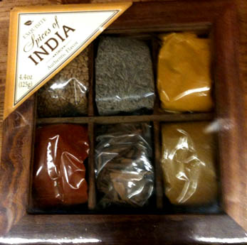 Well, you can imagine how I felt when I walked into World Market in San Diego today and discovered that they were selling a box of “exquisite spices of India” which looked a lot like the box that Geeta had thoughtfully packed for Mohan. I mean, just reflect on the horror: this was in World Market – the chor bazaar for upwardly mobile American latte liberals!