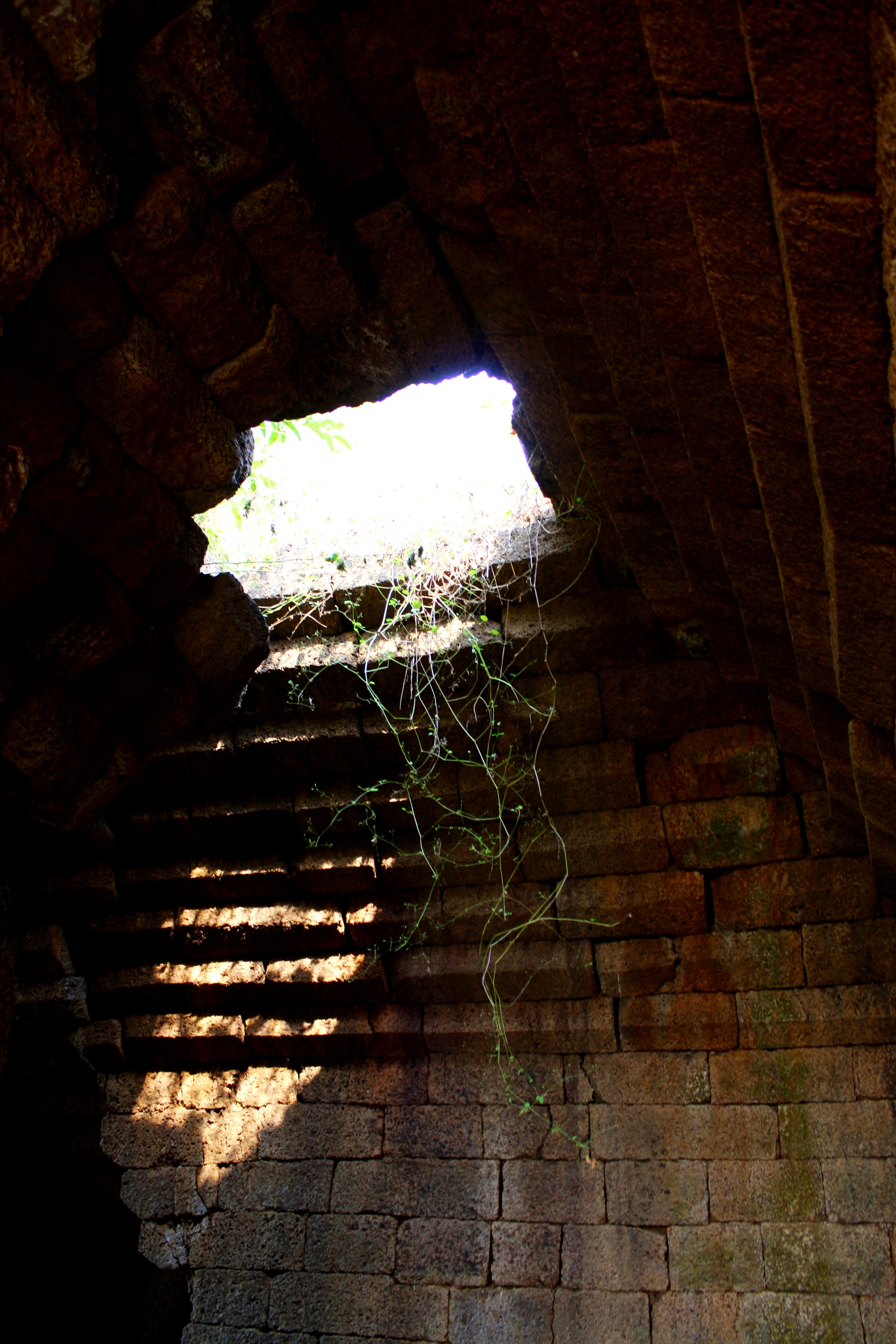 We crossed the courtyard careful not to trample on the paddy that was drying there. Then we saw the structures. The farmers had tied their cows to the stones of the ruined temple. It was difficult to spot the structure, which must not have been more than 20-feet high, because the entire roof was covered with leafy vines. We pushed away cows grazing in the vicinity and entered the ruins. I was encouraged to go further because it was winter – not much of my skin was exposed and I didn’t have to worry about snakes.