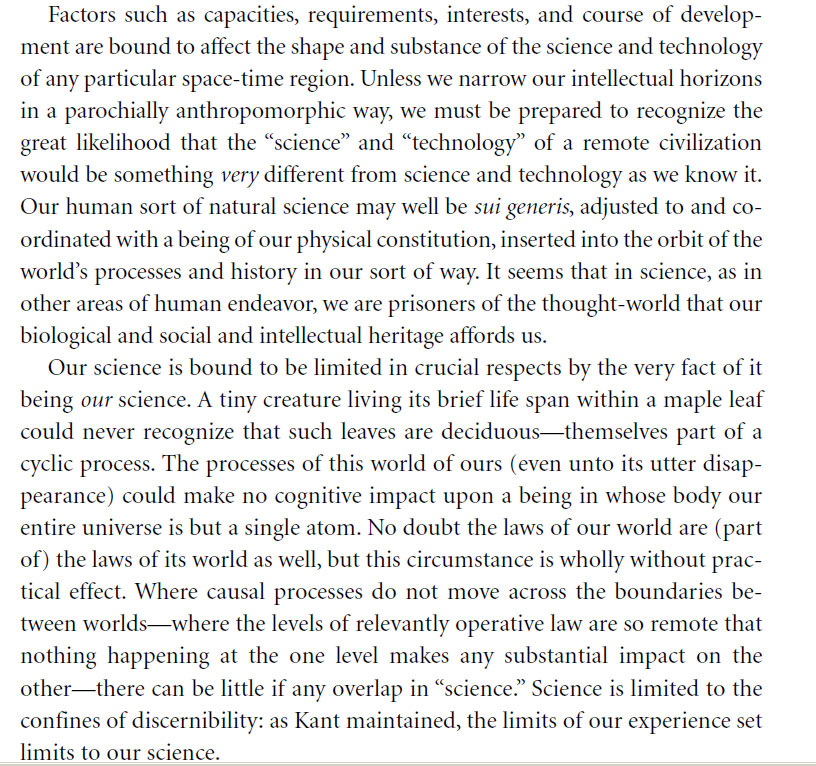 For what it is worth, there is really no way to disprove Rescher’s idea which uses deductive reasoning or to prove to Weinberg’s idea which uses inductive reasoning. Rescher’s thesis that there is another science will always be feasible, because we will continue to be humans, and his underlying deductive principle that humans cannot know any other science will be valid. On the other hand, Weinberg won’t ever be able to prove that science is objective. Just because everything we know up to now seems to support our assertion of an objective truth, doesn’t mean that what we will learn later will necessarily support this theory. Note how Weinberg builds in a “fail-safe” to his argument: everything we know is part of current objective knowledge; however, as our own knowledge changes, there will be “tweaks” to our objectivity.